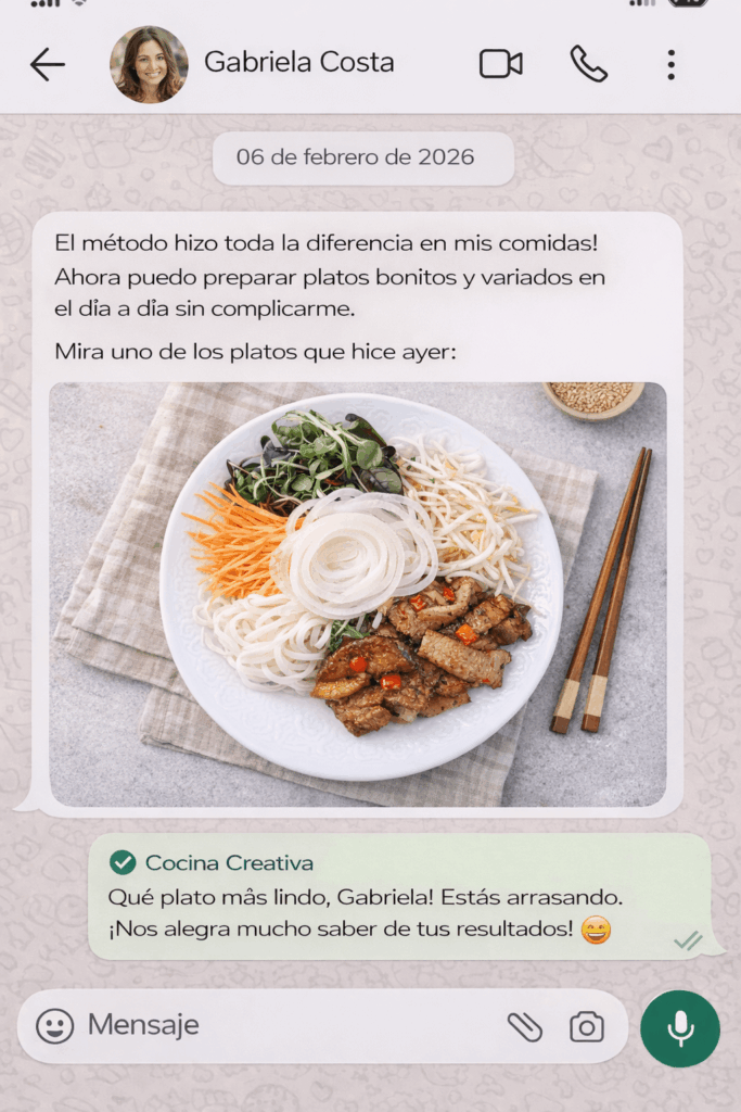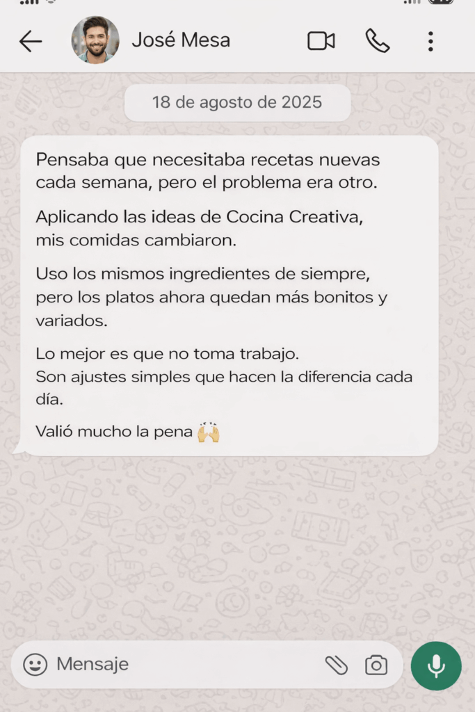 Cocina Creativa fue creado para personas comunes, que cocinan en el día a día y quieren variar, mejorar la presentación y tener más ideas — sin técnicas difíciles.